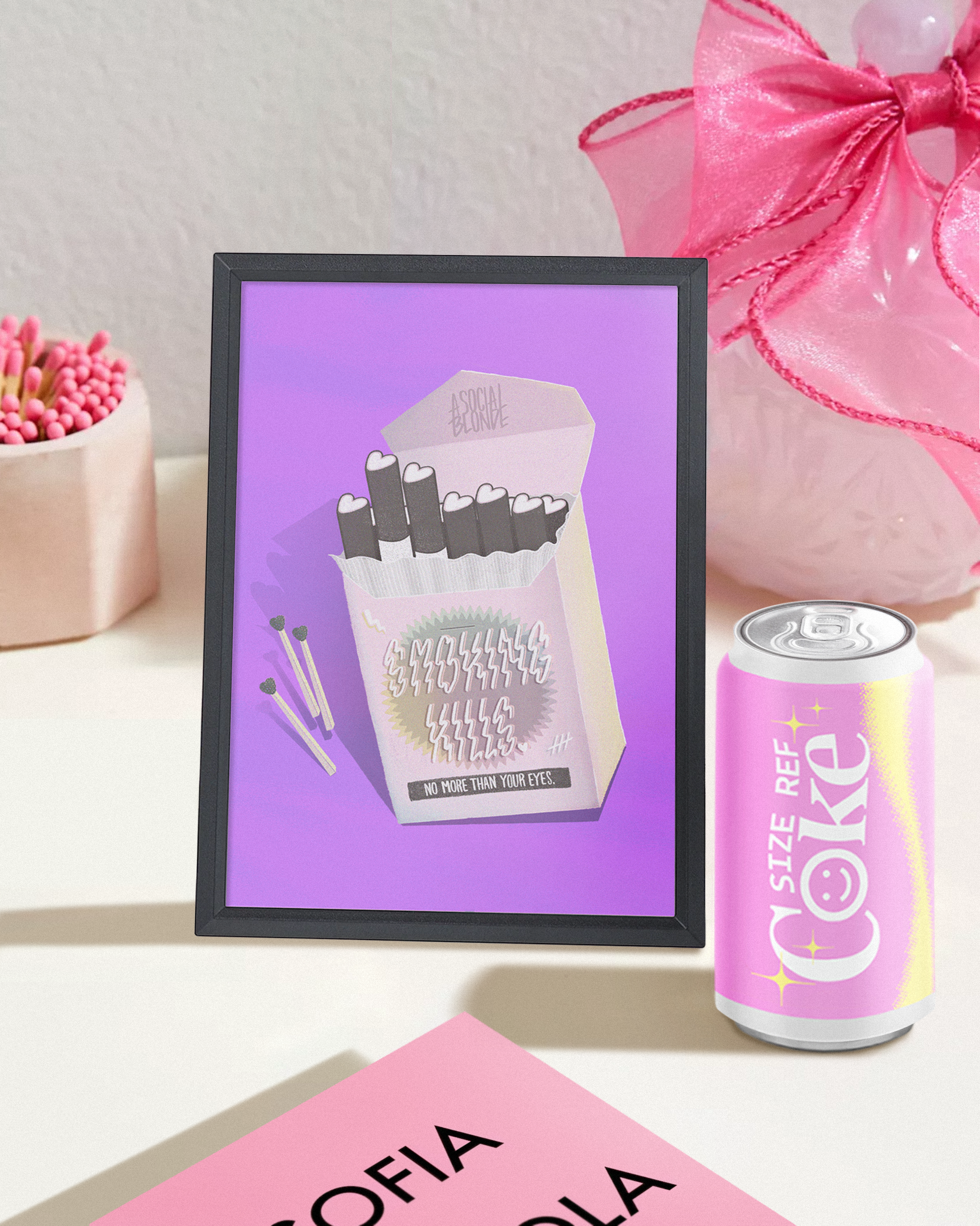 Smoking Kills: Light up your space with this cheeky kawaii print! It's like a compliment wrapped in a cigarette box…funny, cute, and a gentle reminder. Elevate your vibe with our locally printed art, proudly crafted in Ontario. Plus, frame options available to make your piece truly pop and ready to hang!