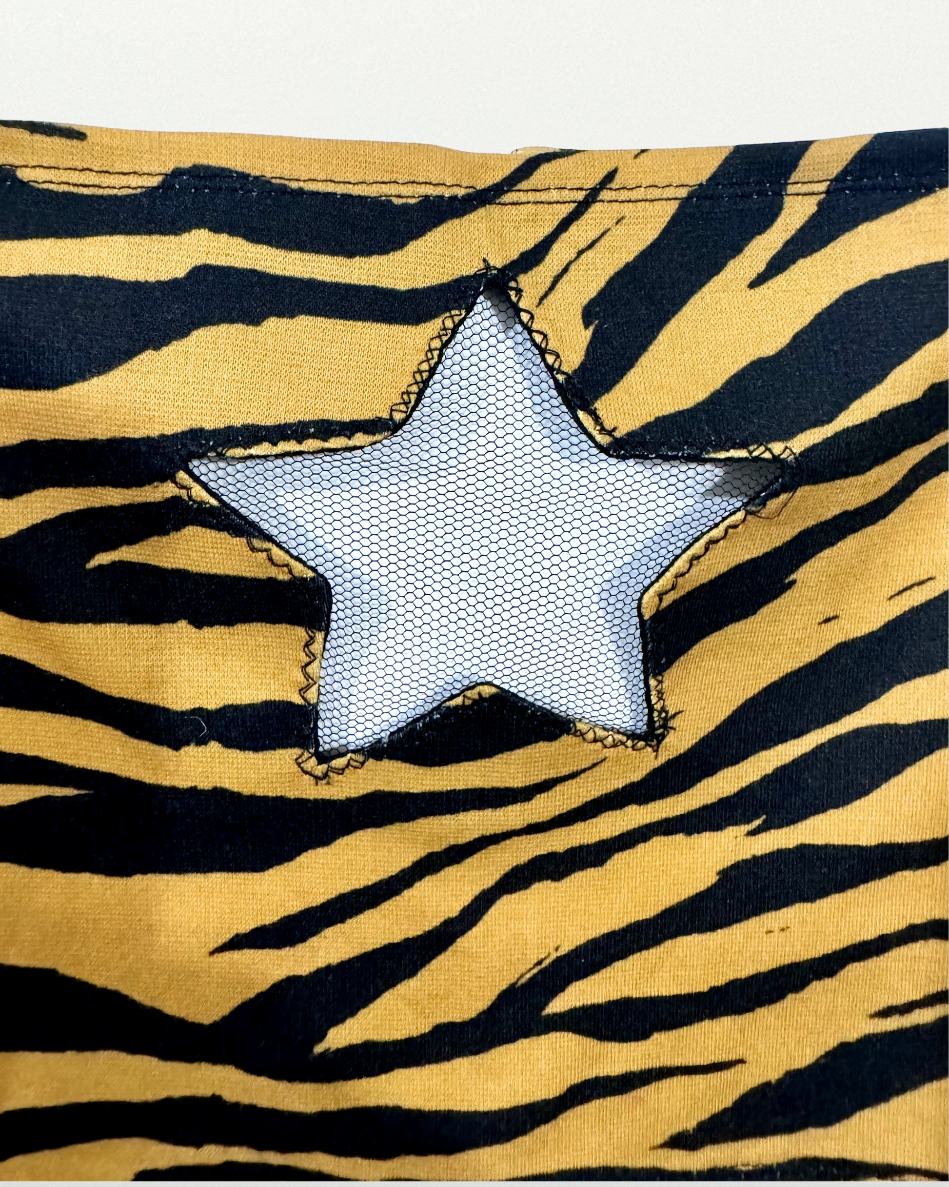 Catch a shiny ✨ this is a one-of-a-kind piece! Upcycled from a pencil skirt, bold, and totally one-of-a-kind. Featuring a tiger stripe design and star cutout, this top brings fierce Kawaii-Punk vibes with a sustainable twist. Adjustable tie-back for the perfect fit.